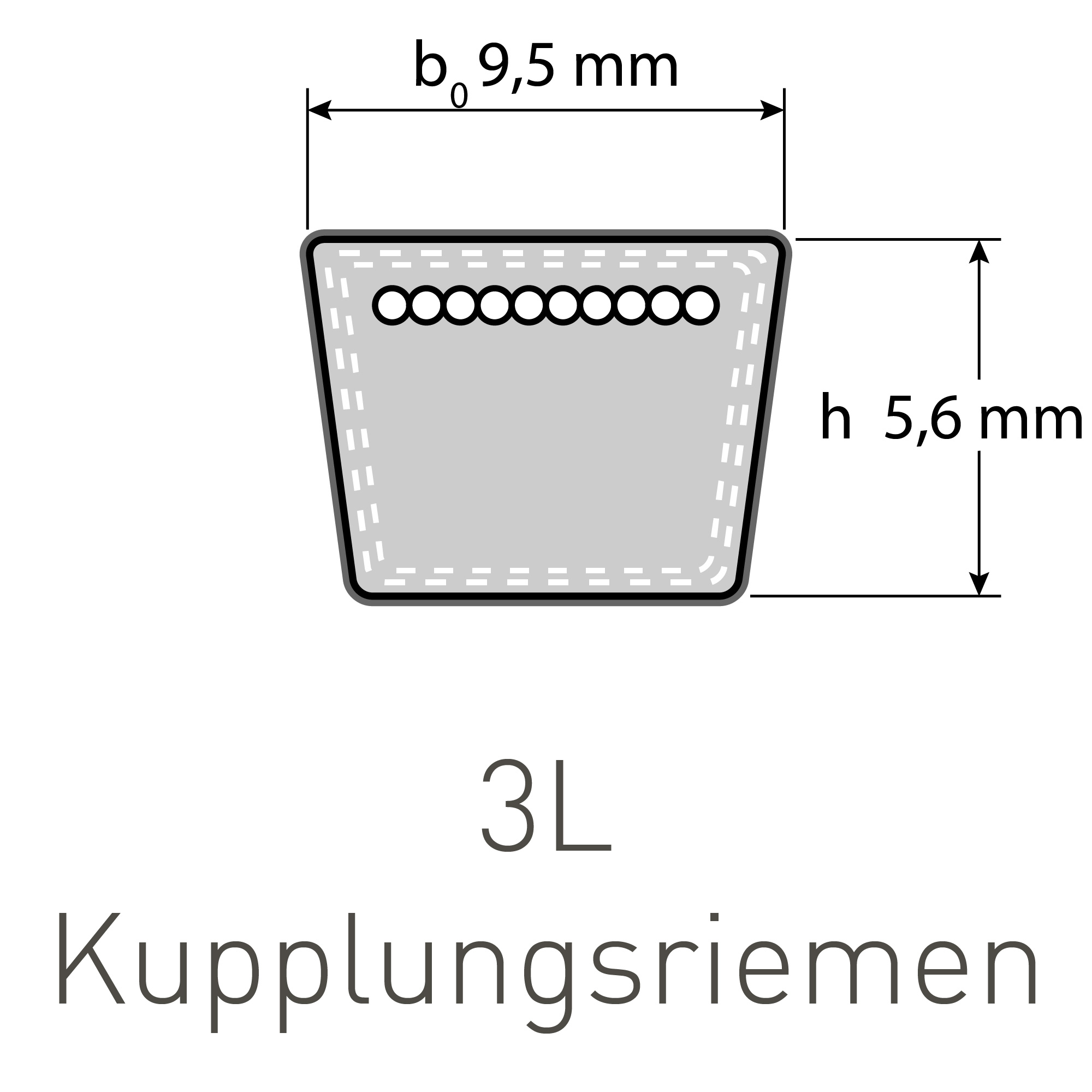 Kupplungsriemen im Profil 3L mit Außenlänge 559 mm (22"). Der Riemen besitzt einen robusten Chloropren-Riemenkörper, einen hochfesten Aramid-Zugstrang sowie eine spezielle Baumwoll-Textilummantelung. Durch diese hochfeste Konstruktion ist der Riemen extrem haltbar, besonders formstabil und dehnungsarm – ideal für kompakte, stark beanspruchte Antriebe mit häufigen Lastwechseln.