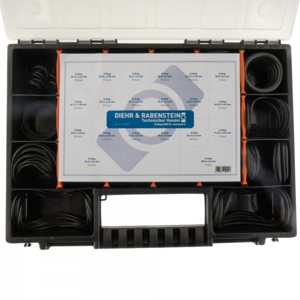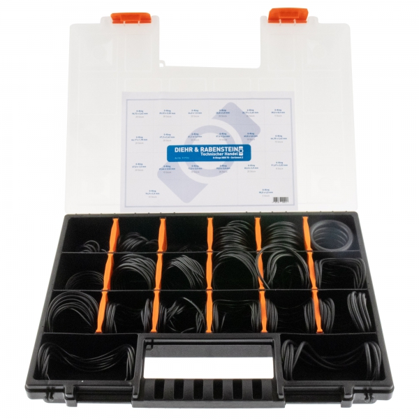 Produktinformationen "Sortiment 2 / O-Ringe nach DIN 3601, 323 Stück insgesamt, unterschiedliche Durchmesser und Schnurstärken, Material NBR, Shorehärte 70"